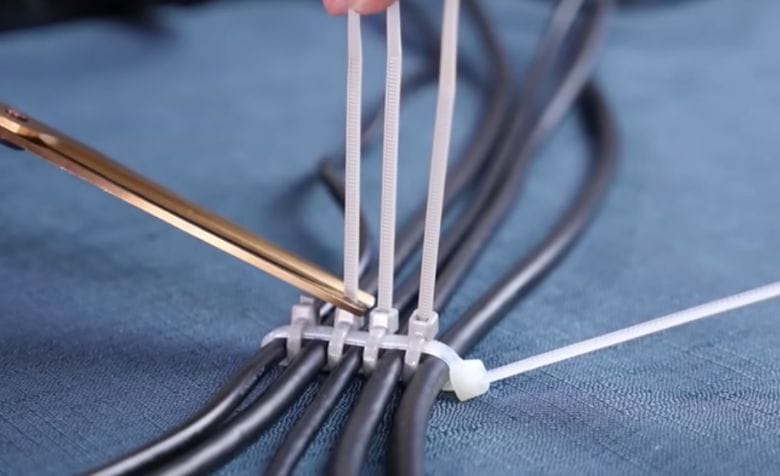 This must be a familiar problem to many people: cables getting tangled beyond belief. Your television, DVD-player and speakers all lead to the same power strip, and before you know it, all of those cables are one big tangled mess. You can very easily solve this problem by loosely tying a zip tie around the cables. Make sure that the cables are all placed next to each other tidily. Divide the cables from each other by tying more zip ties to the first zip tie like in the picture below. All of the cables will have their own hole in between the zip ties. Use a pair of scissors to cut off the ends of the zip ties.